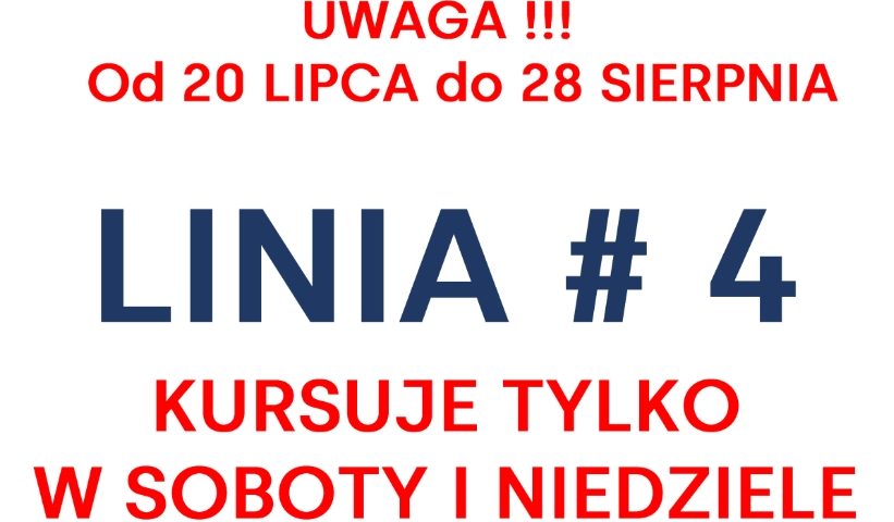 Z powodu bardzo małej ilości pasażerów od poniedziałku 20 lipca do końca wakacji szkolnych, czyli terminu powrotu dzieci do szkół, zostanie wstrzymane kursowanie linii nr 4 w dni powszednie.